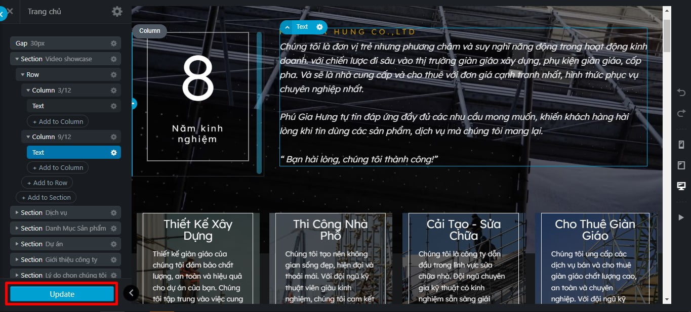 Sau khi chỉnh sửa xong nội dung bạn chọn Apply -> chọn tiếp Update để cập nhật nội dung mới
