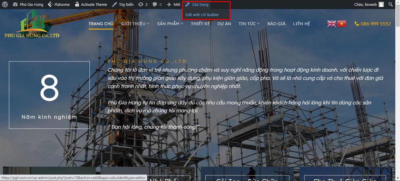 Lúc này trang web được chuyển sang trang chủ website, để chỉnh sửa nội dung tiếp tục di chuột đến Sửa trang và chọn Edit with UX Builder
