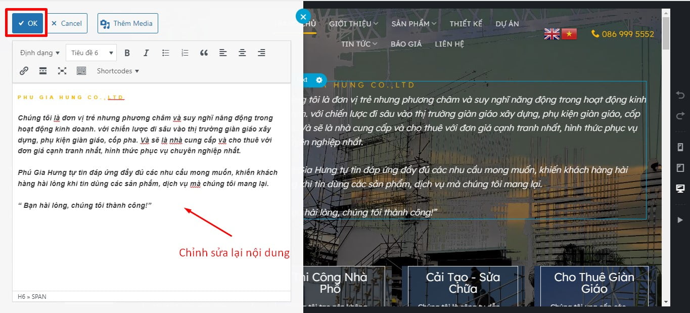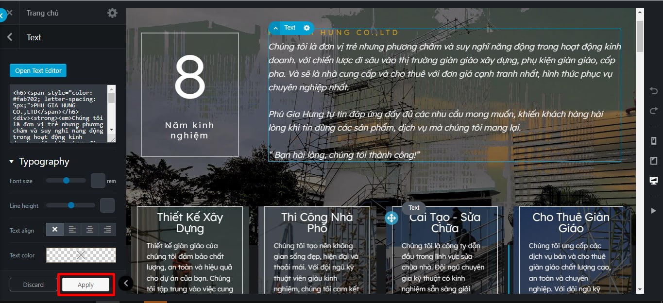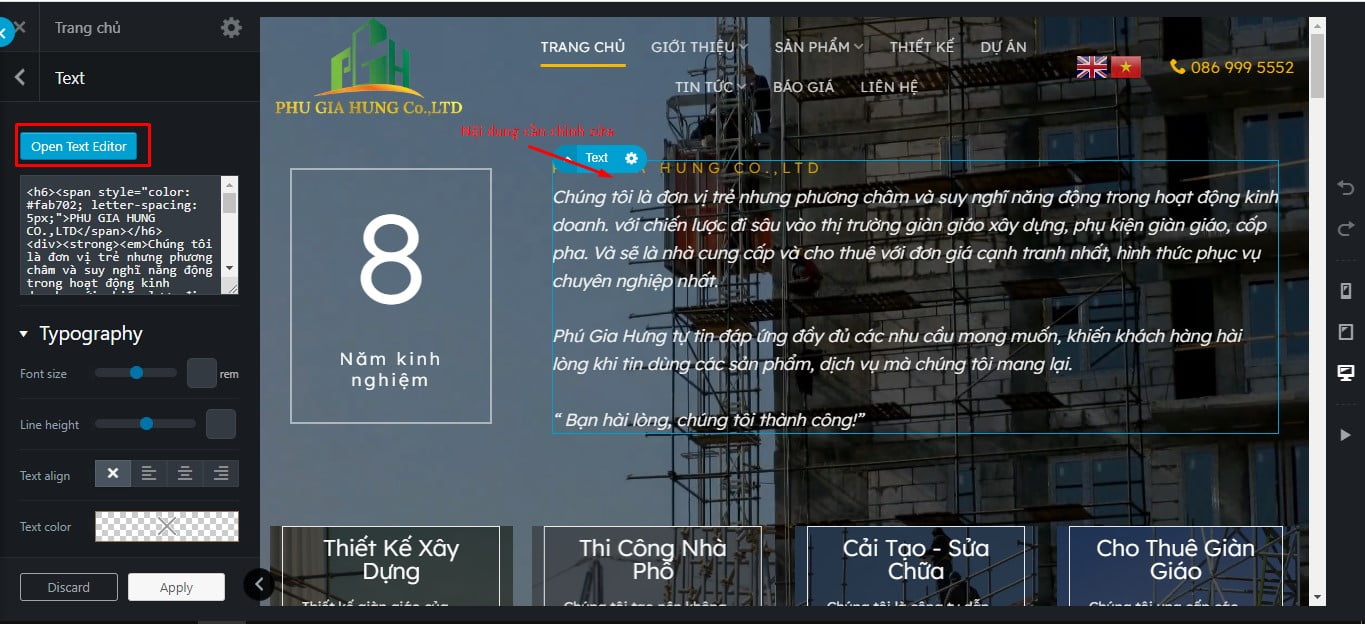 Giao diện chỉnh sửa sẽ xuất hiện, để chỉnh sửa nội dung bạn click chuột vào nội dung cần chỉnh sửa và chọn Open text editor