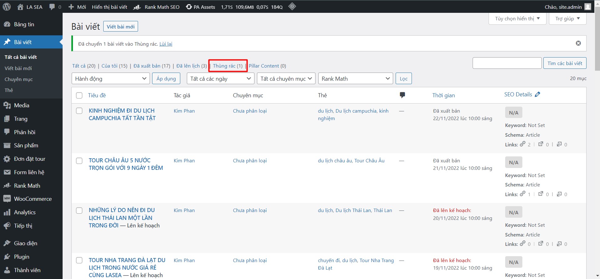 – Tại giao diện Tất cả bài viết, di chuột vào bài viết cần xóa chọn -> Thùng rác như ảnh bên dưới