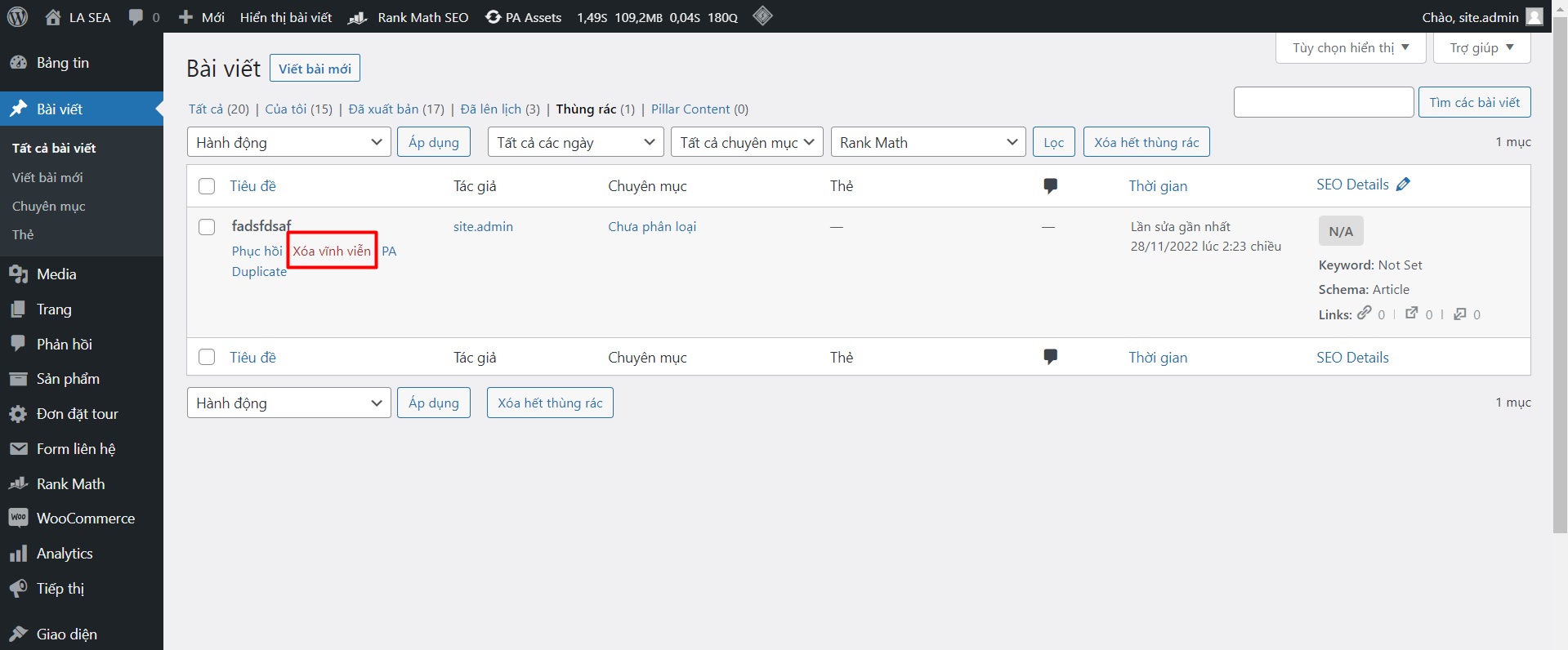 – Giao diện thùng rác như ảnh bên dưới, quý khách di chuột vào bài viết cần xóa chọn -> Xóa vĩnh viễn để xóa sản phẩm vĩnh viễn