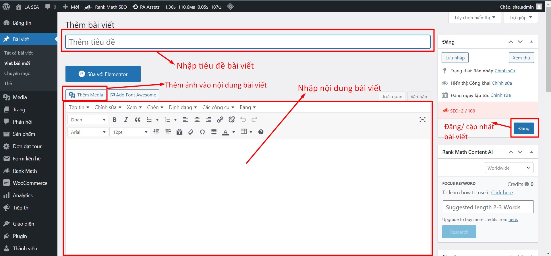 – Giao diện thêm bài viết (tương tự sản phẩm/ dịch vụ) như ảnh bên dưới. Quý khách nhập nội dung như hướng dẫn:
