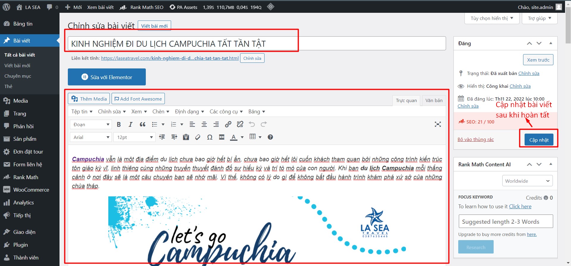 – Giao diện chỉnh sửa bài viết tương tự giao diện Thêm mới bài viết. Quý khách nhập các thông tin cần sửa sau đó nhấn Cập nhật để lưu lại bài viết: